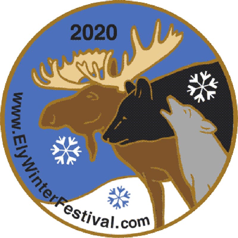 The pin for the 2020 Ely Winter Festival, designed by artist and snow carver Nancy Scheibe, is on sale now on the website and will be in stores around Ely in November. It pictures a moose, a bear and a wolf, three of our most famous wildlife up here in the north. Of course, you won’t see a bear in the winter (those smarties are out of the cold, sleeping) but if you visit the International Wolf Center in Ely, you certainly can view some wolves!